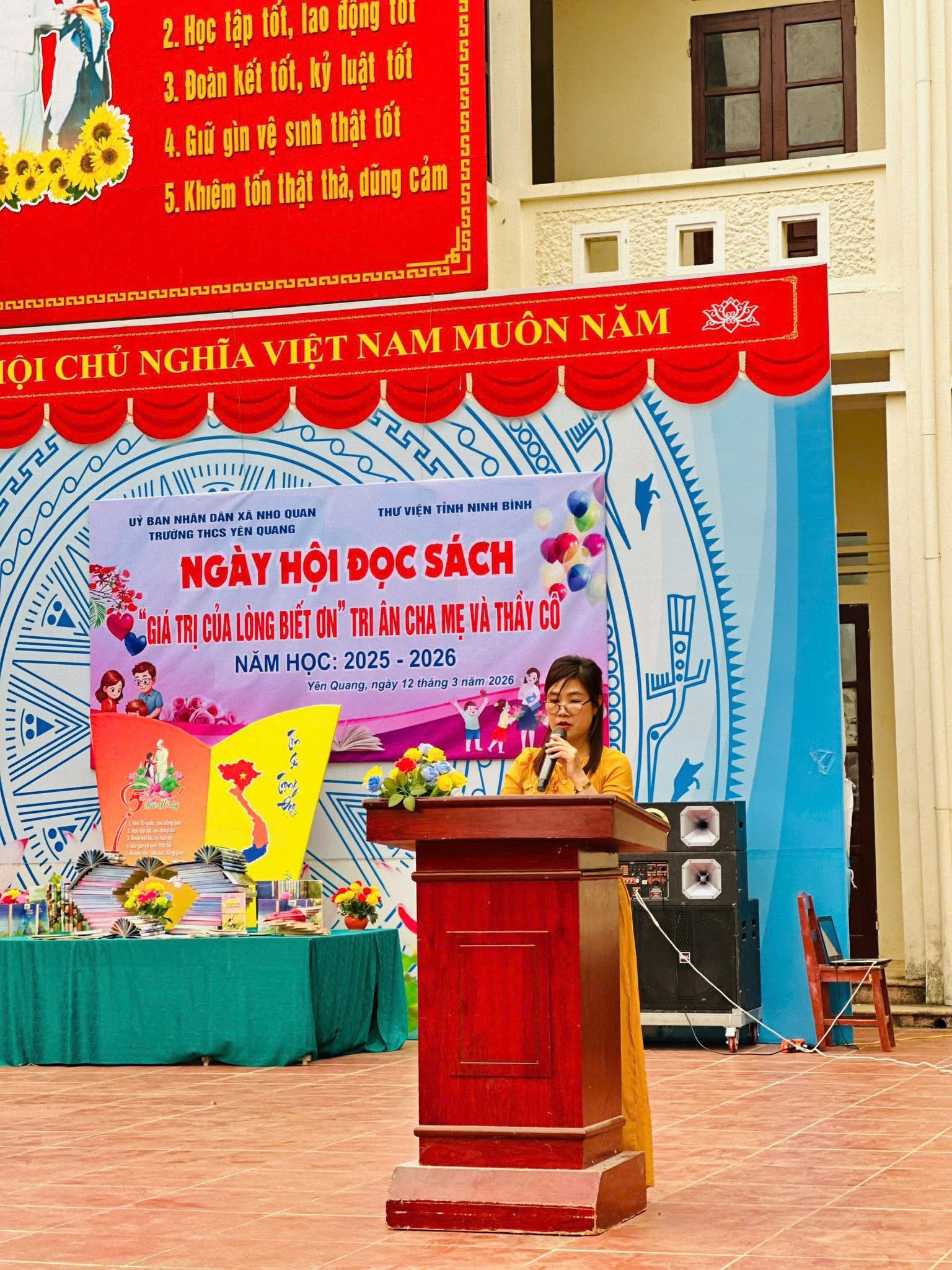 Hoà chung với không khí cả nước vừa kỷ niệm 116 năm Ngày Quốc tế Phụ nữ 08/3 và hướng tới Ngày Sách và Văn hóa đọc Việt Nam 21/04/2026, chiều ngày 12/03/2026, Trường THCS Yên Quang phối hợp với Thư viện tỉnh Ninh Bình tổ chức chương trình “Ngày hội đọc sách – Giá trị của lòng biết ơn: Tri ân cha mẹ và thầy cô giáo”.